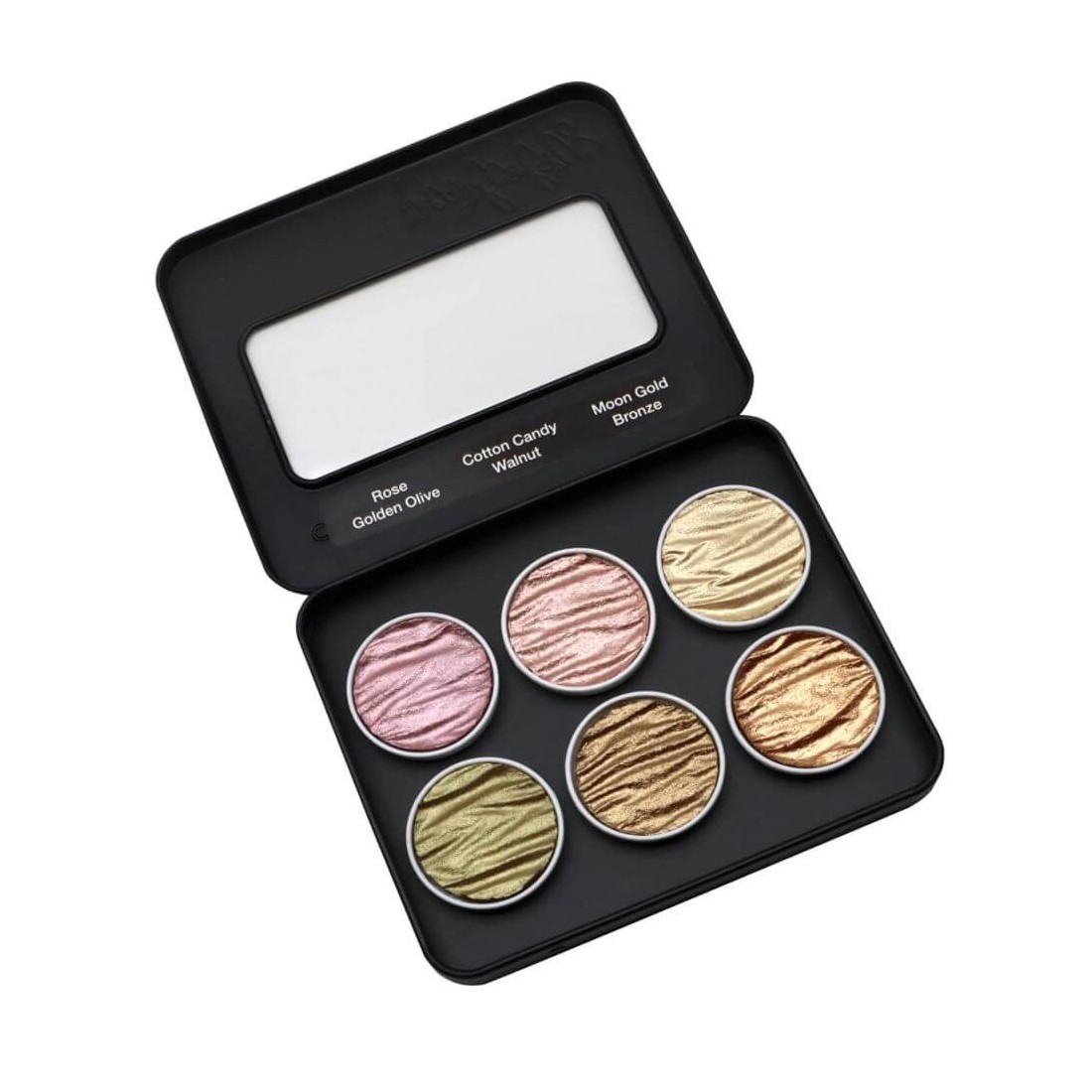 Tillverkad av glimmer, ett naturligt mineral som erbjuder ett brett utbud av metalliska nyanser, från guld och silver till iriserande, lysande pärlfärger. Aktivera med lite vatten på paletten och applicera på nib med en pensel. Klibbar alla absorberande ytor, såsom papper, trä, gips, etc.